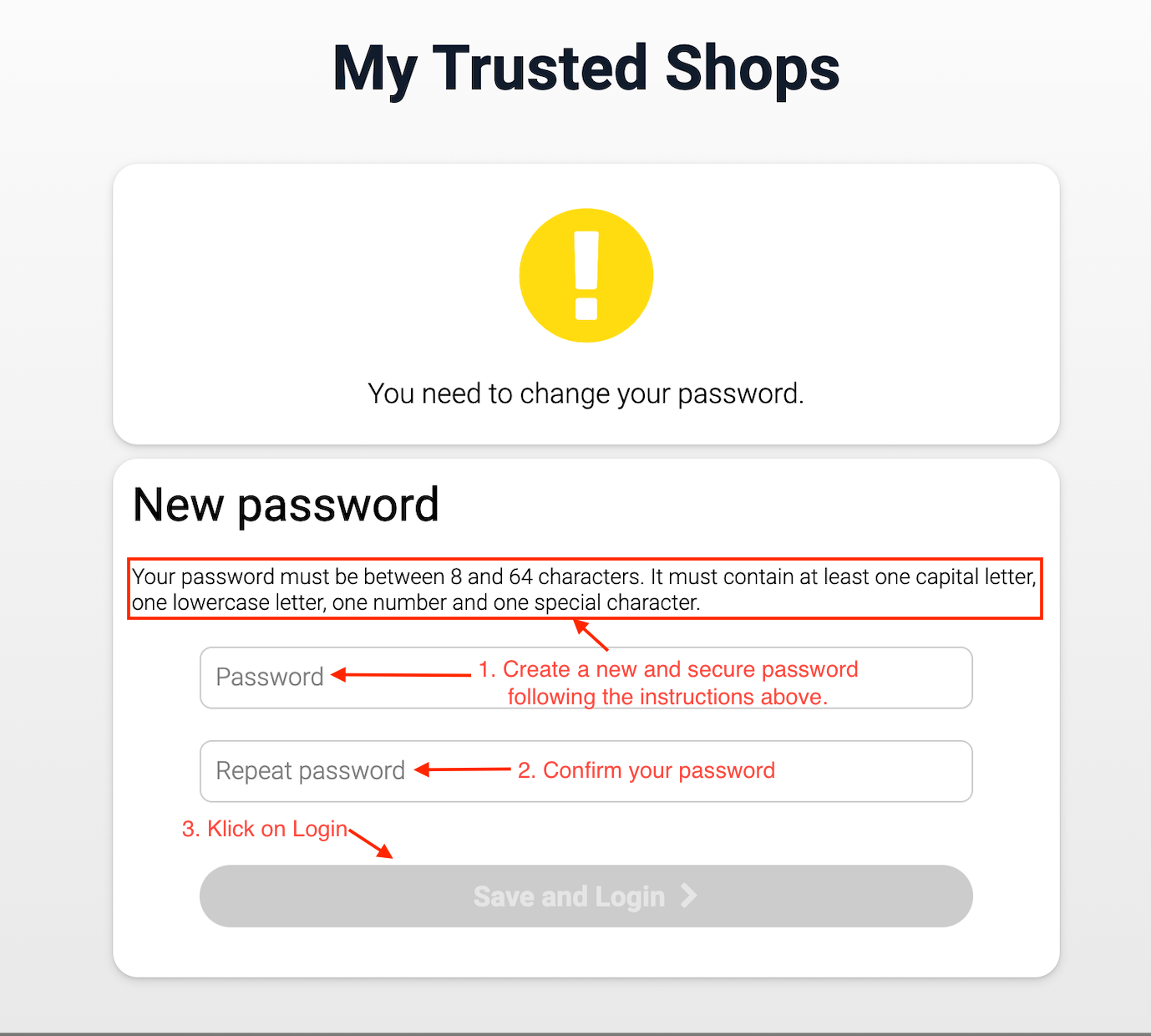 4. As a result of your new password, you will be automatically logged in and find yourself in your Trusted Shops account. You can now continue with point 1./4. for the rating change for existing accounts.